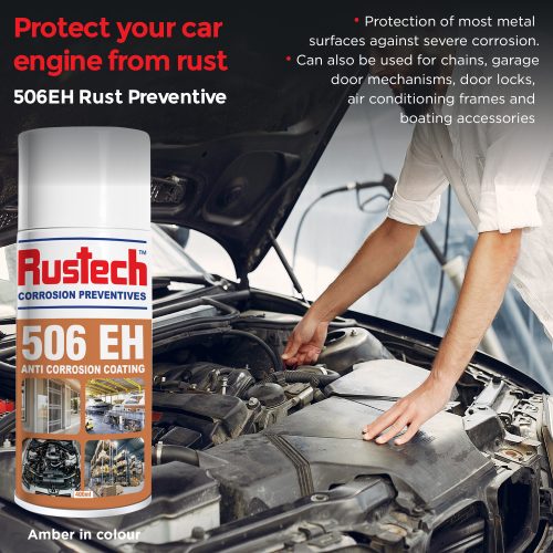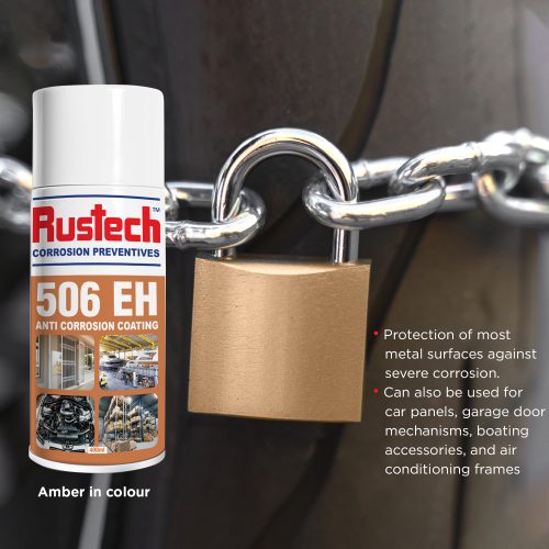 Rustech 506EH Rust Preventive provides strong protection against severe corrosion on most metal surfaces, helping to safeguard costly equipment. It is safe for use on paint, plastics, rubber, and chrome, easy to apply by spray, dries quickly with a wax finish, and is suitable for both indoor and outdoor use.