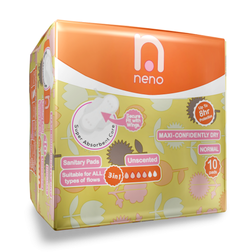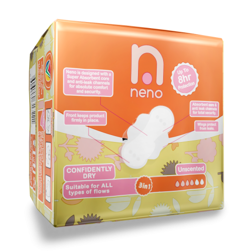 Neno is a maxi pad, silky, highly absorbent, and unscented pad with wings. The front keeps firmly in place, and it has anti-leak channels for total security. It’s a 3 in 1 (accommodates inconsistency of blood flow) pad- suitable for all types of flows. It is designed to provide the ultimate comfort during both the day and night.