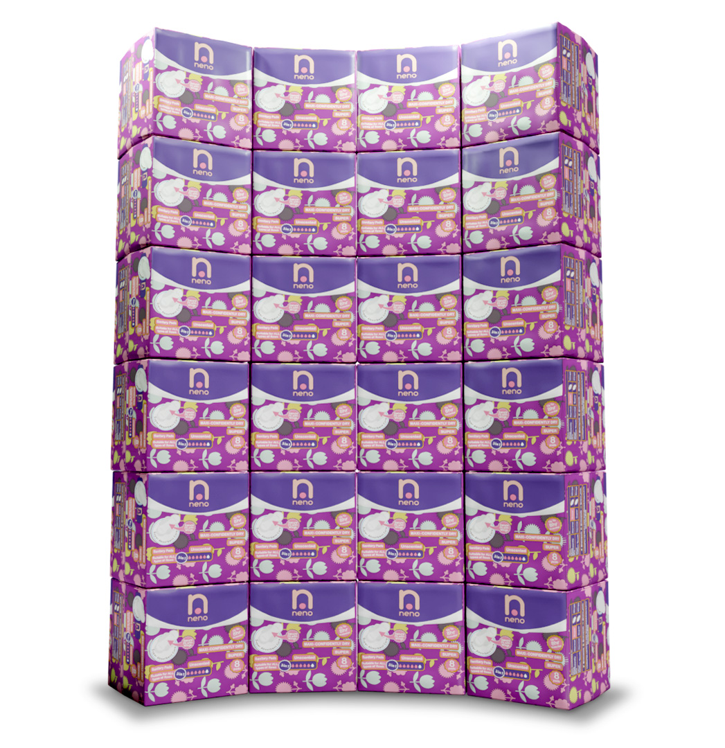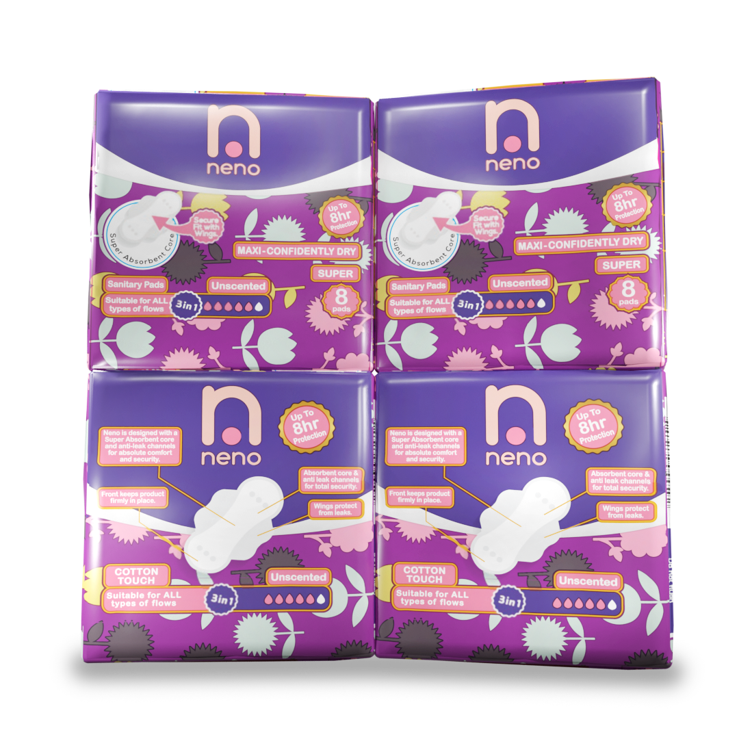 Neno is a maxi pad, silky, highly absorbent, and unscented pad with wings. The front keeps firmly in place, and it has anti-leak channels for total security. It’s a 3 in 1 (accommodates inconsistency of blood flow) pad- suitable for all types of flows. It is designed to provide the ultimate comfort during both the day and night.
