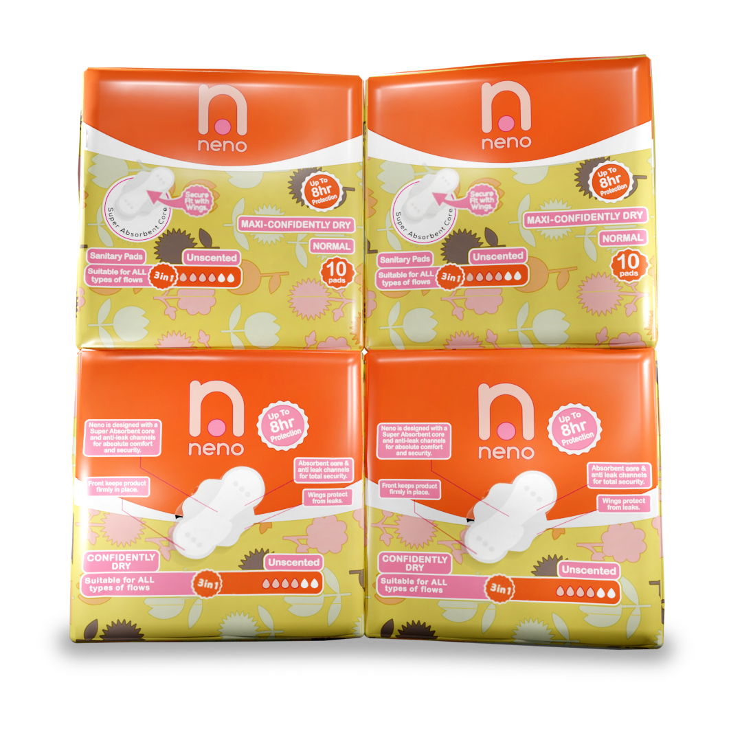 Neno is a Maxi pad, silky, highly absorbent, and unscented pad with wings. The front keeps firmly in place, and it has anti-leak channels for total security. It’s a 3 in 1 (accommodates inconsistency of blood flow) pad- suitable for all types of flows. It is designed to provide the ultimate comfort during both the day and night.